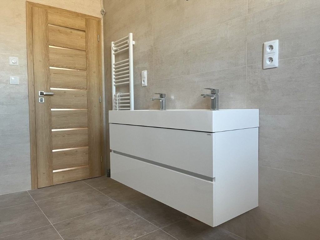 Součástí ceny jsou vnitřní zařizovací předměty – sanita a obklady v koupelně, podlahové krytiny, dveře vč. zárubní. Jediné, co zbývá na Vás, je kuchyňská linka. Ta není v ceně domu zahrnuta.