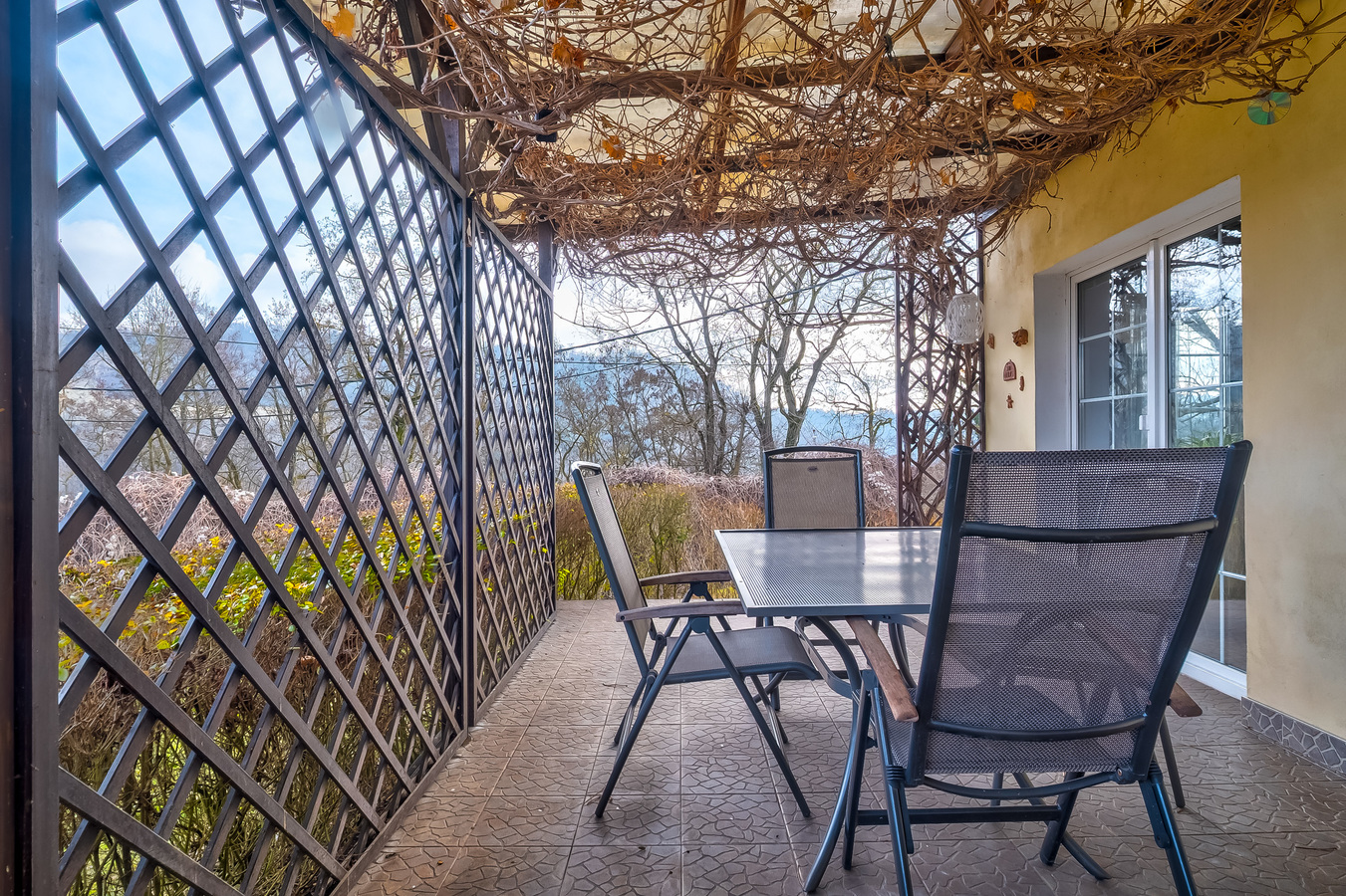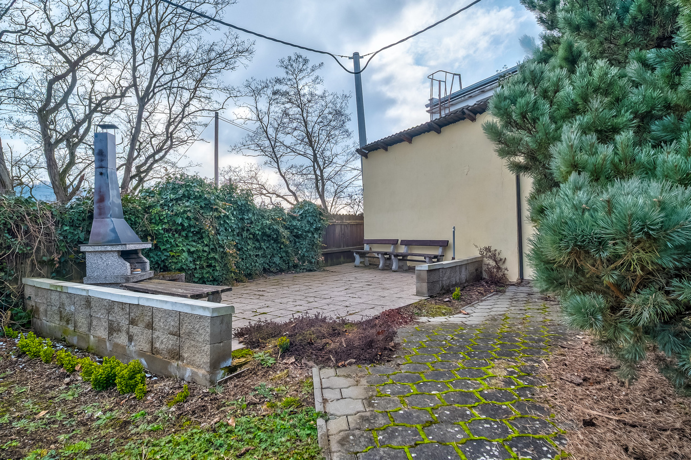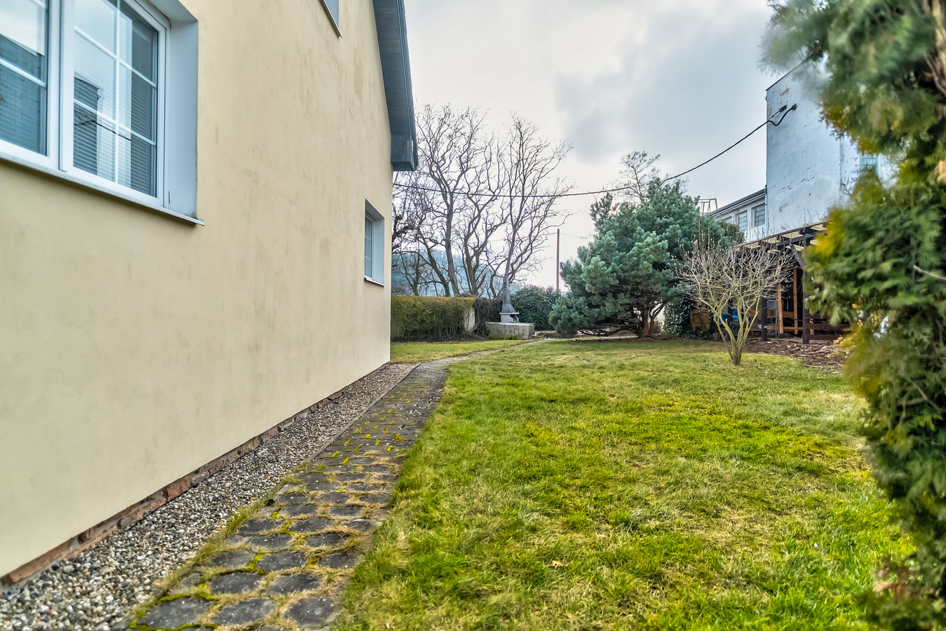 Patrový dům prošel v r. 2015 rekonstrukcí. Díky velkým oknům je interiér příjemně prosvětlený. Okna zároveň přirozeně propojují obytný prostor s rovinatou zahradou, kde se nachází bazén, prostorná terasa s výhledem na zámek a okolní krajinu, venkovní posezení s krbem a kryté parkovací stání pro dvě auta. Detailní dispozice domu je k dispozici v přiloženém půdorysu.