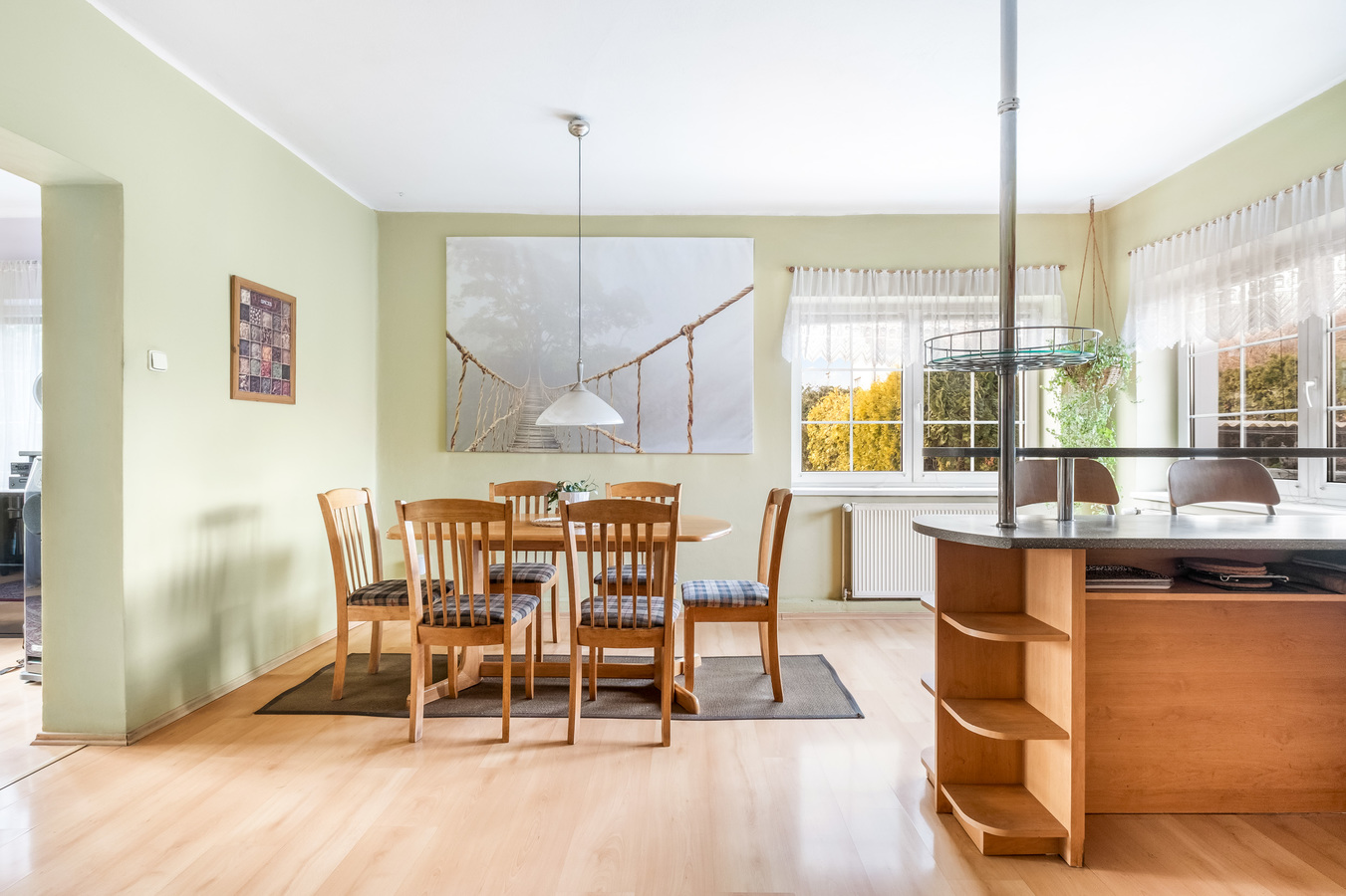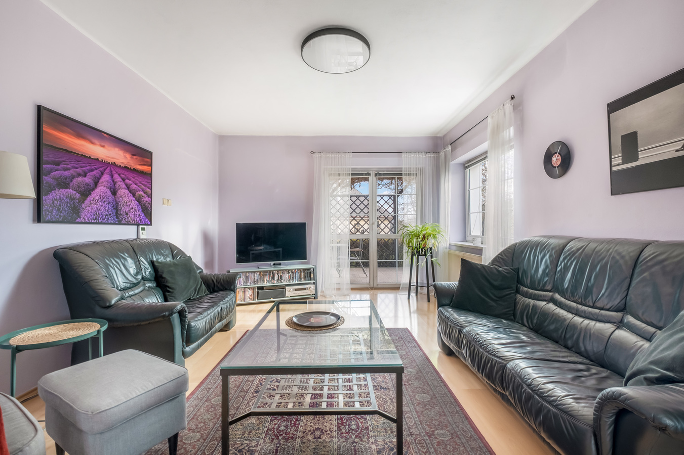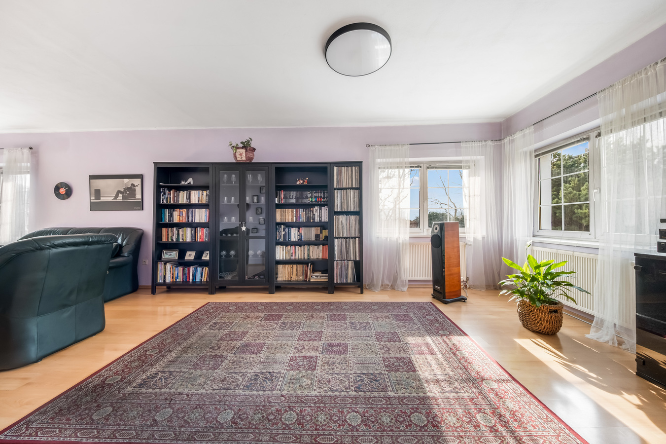 Patrový dům prošel v r. 2015 rekonstrukcí. Díky velkým oknům je interiér příjemně prosvětlený. Okna zároveň přirozeně propojují obytný prostor s rovinatou zahradou, kde se nachází bazén, prostorná terasa s výhledem na zámek a okolní krajinu, venkovní posezení s krbem a kryté parkovací stání pro dvě auta. Detailní dispozice domu je k dispozici v přiloženém půdorysu.